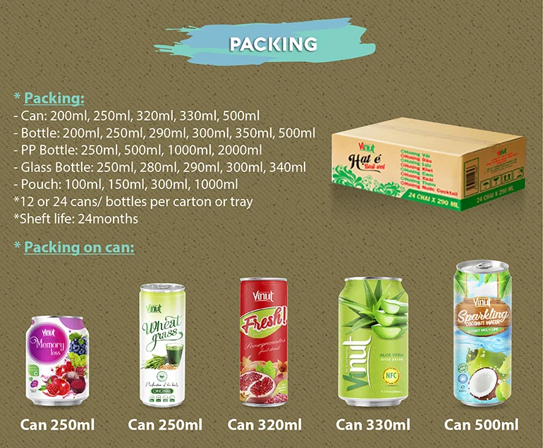 VINUT Beverage Vietnam's leading beverage manufacturer and exporter. We produce: coconut water products, aloe vera juice, energy drinks, fruit juices, range of coffee drinks, sparkling coconut water... All our drinks come from natural sources.never concentrate.