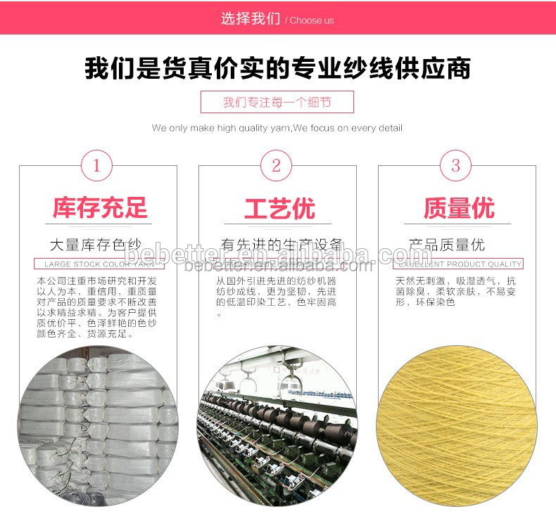 Supply capacity: Annual output 6,000 tons port: Qingdao/Shanghai usage: Knitted and woven feature: Sustainable and recyclable Packaging details: Packaging: carton, 15 tubes/carton, 25KGS/carton Yarn count: 24 nautical miles/1 brand: sunshine Evenness: even Place of origin: Henan, China style: fancy.... -
