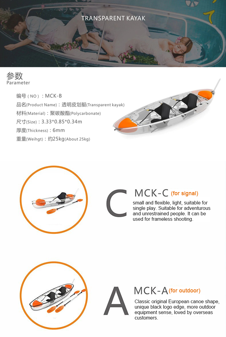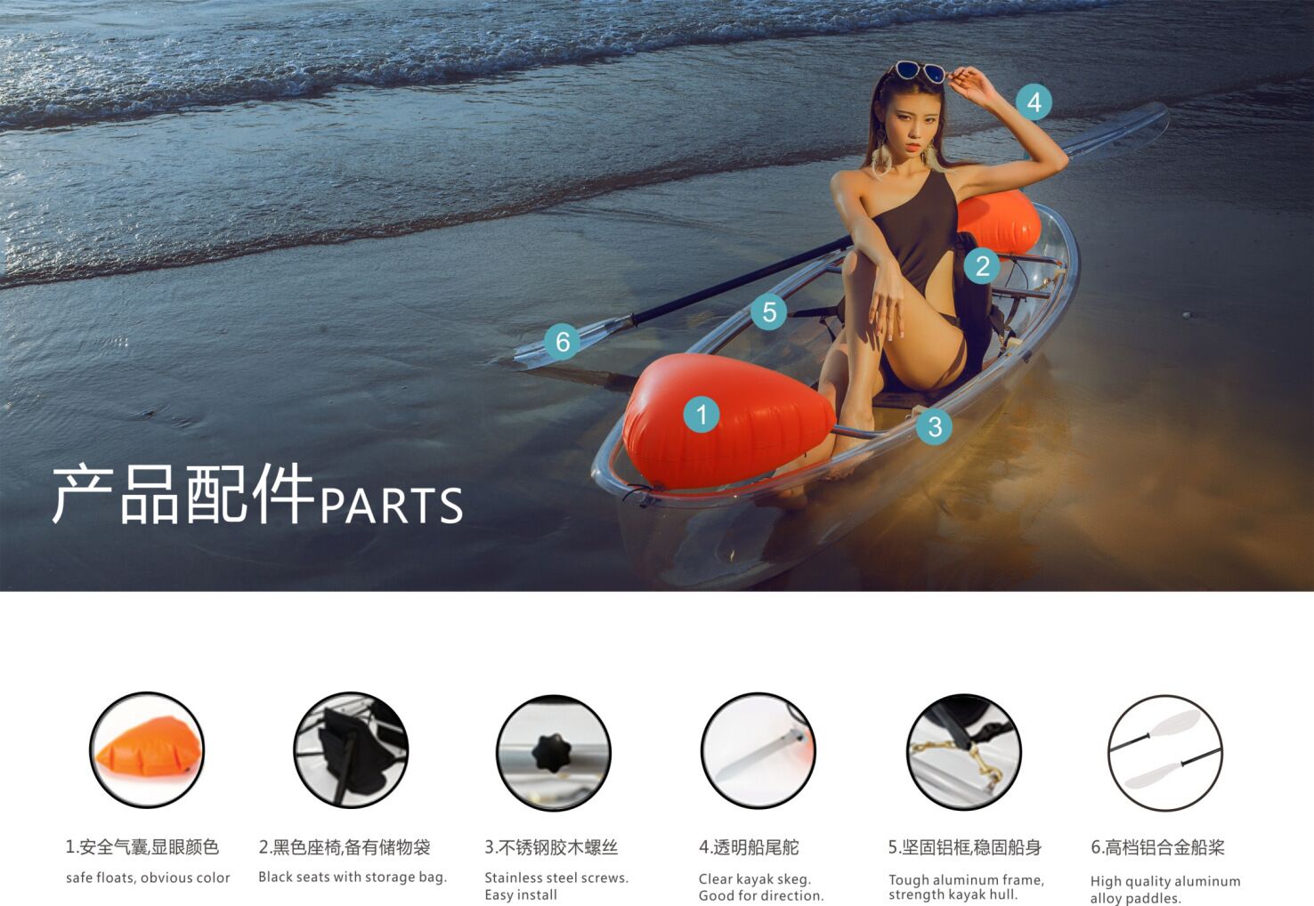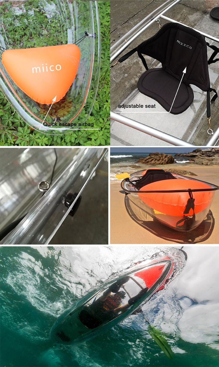 | Paddle, airbag color: | Orange, red, yellow, black, blue, white, green... | Kayak Color: | clear crystal |