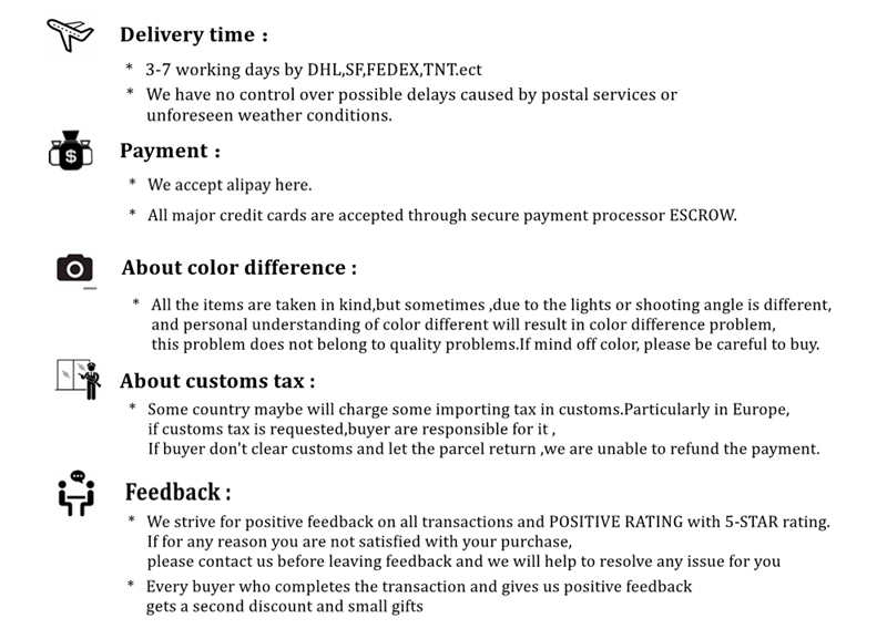 | shipping | Usually ship by DHL / UPS / Fedex |