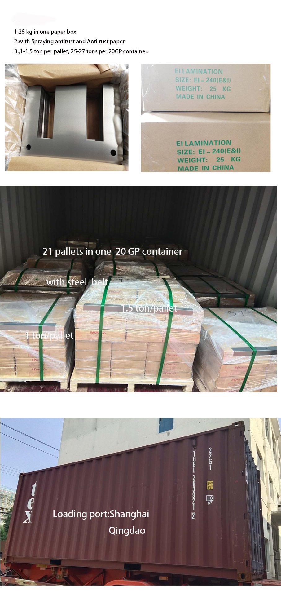 | Package | A carton of 25 kg, sprayed with anti-rust and anti-rust paper, 1-1.5 tons/pallet, 25-27 tons/20GP container. | ||||