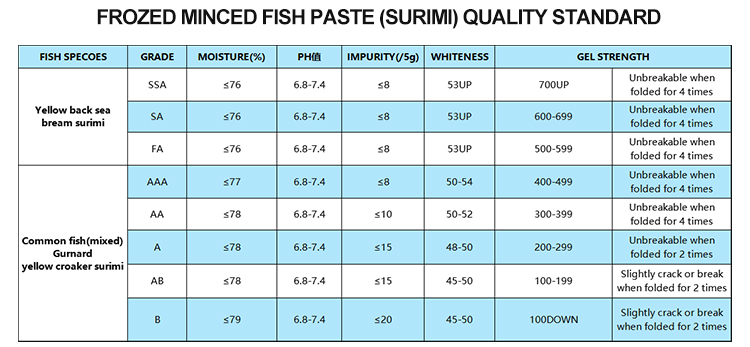 grade: SA, FA, AAA Products include: ESO surimi, big fish surimi, golden time surimi, mixed surimi Shelf life: 12 months below -18℃ model: surimi brand: Hong Kong Package: Box Freezing process: BQF Certification: HACCP, QS, Halal Origin: China Weight (kg): 10KG/block*2/box gel: 600-699, 500-599,...... -