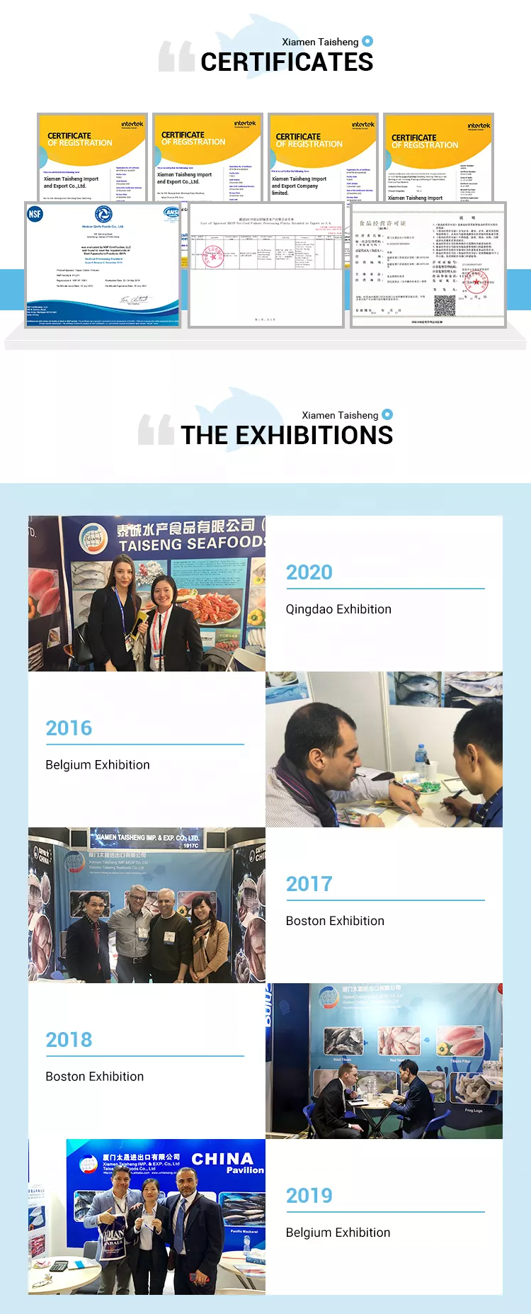 Located in Fujian Province, China. Since 2003, we have been specialized in international fresh and frozen seafood processing and trading. We have a creative, efficient and united professional team. We have supplied to more than 60 countries and regions such as the United States, the European Union, the Middle East, and Southeast Asia.
