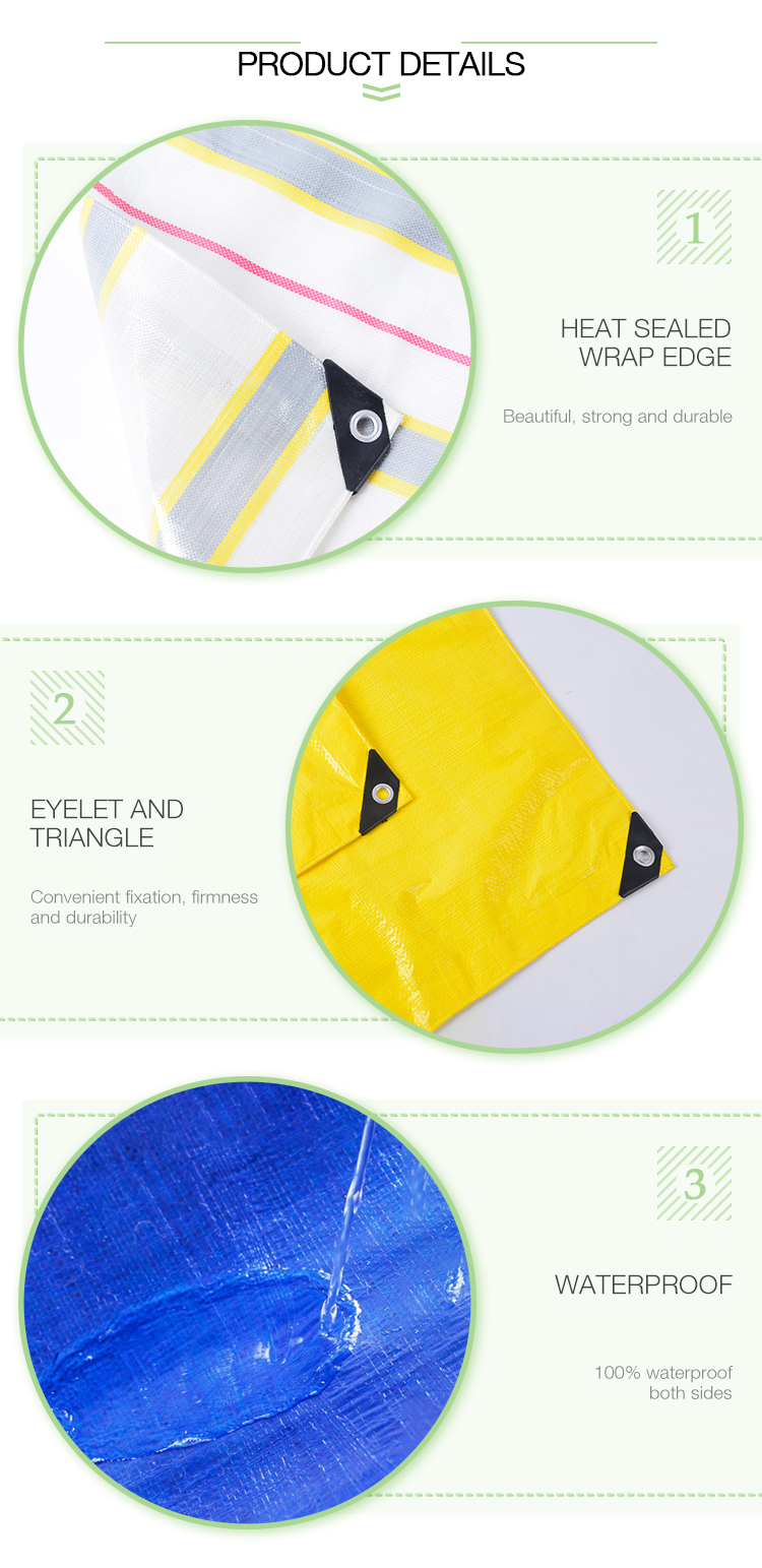 use: outdoor, waterproof, cover, tent Edge processing: Hem PP rope heat sealing thickness: light weight: 50gsm-400gsm supply type: Made to order Outer packing: Woven bag or carton treat: UV treatment or as your request Origin: Shandong, China (Mainland) structure: 100% HDPE woven inner layer, LDPE..... -