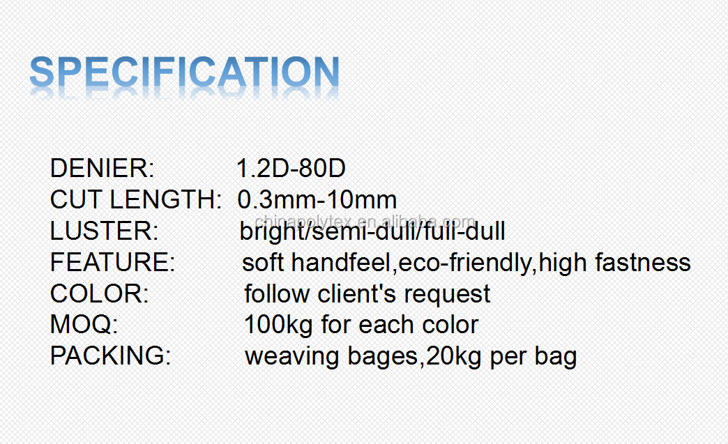 Fiber Length: 0.3mm-12mm Package: Woven bag. 10-15 kg per bag. Origin: Jiangsu, China Package preview: feature: Sustainable, Flame Retardant use: Curtains, decorative fabrics, packaging flocking, etc. illustrate: soft, easy to dye Product Category: nylon luster: semi-dark, dark, bright Fineness:...... -