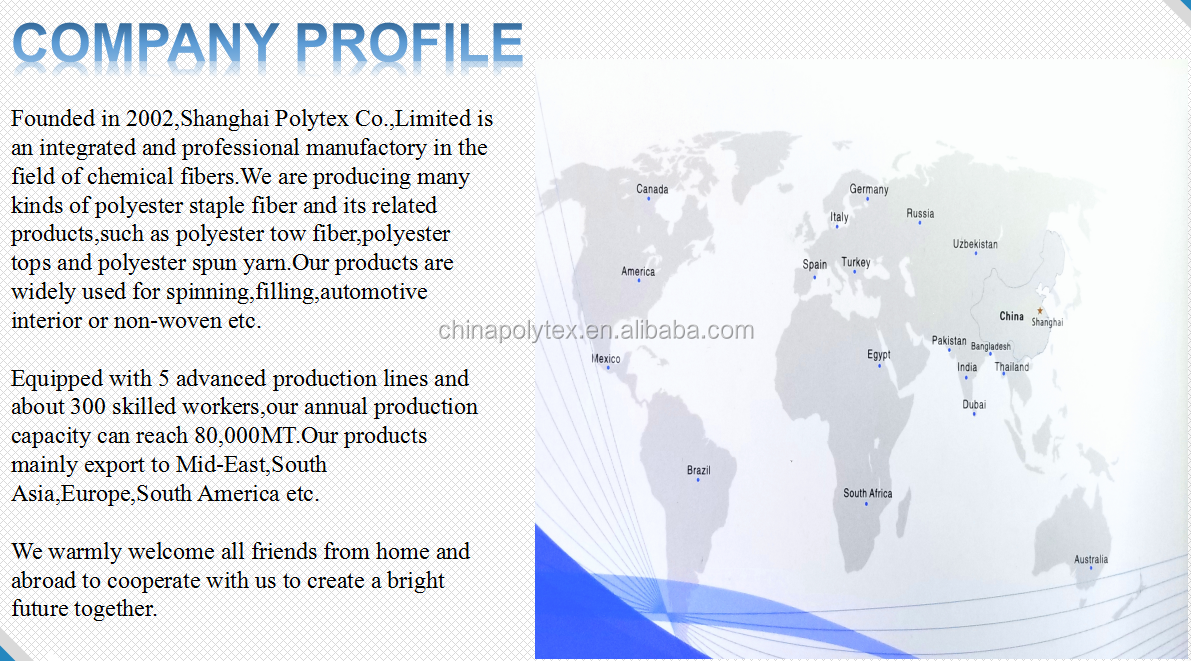 model: 1.2D-80D luster: bright brand: Venus Supply capacity: 2000 tons per month Fiber length: 38mm-120mm port: Ningbo color: white Package preview: Moisture: 35-40% Place of origin: Zhejiang, China use: Filling materials, non-woven fabrics, spinning, weaving feature: Sustainable payment terms:...... -
