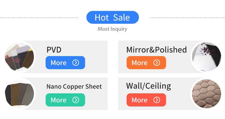 A2: Yes, we can do all kinds of surface treatment, such as PVD surface treatment, mirror surface treatment, embossed surface treatment, etching surface treatment, copper surface treatment, etc., the colors are gold, titanium, rose gold, black, bronze, Blue, green, purple, etc.