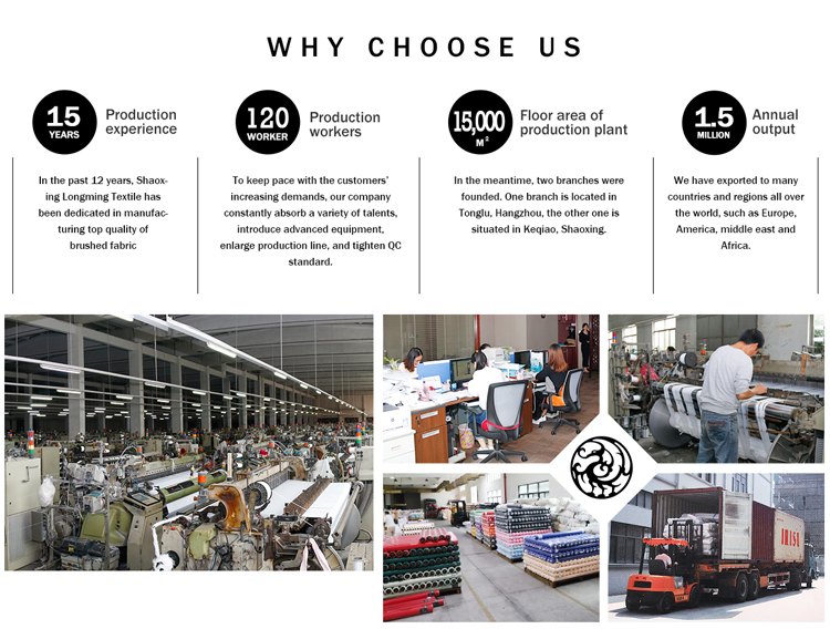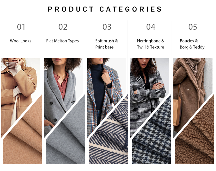 - Our products are mainly coat fabrics, including wool-like fabrics, PVE double brushed fabrics, melton and velvet finishing, TR/polyester brushed fabrics.