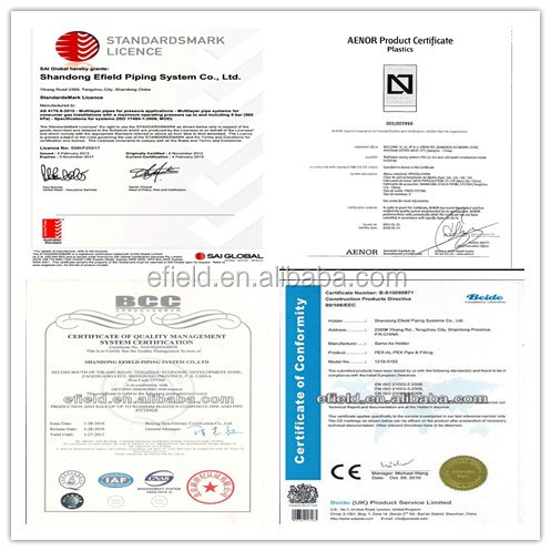 EFIELD PEX pipes have passed North American NSF certification, PEX pipe fittings have passed Australia WaterMark certification, and CE certification;
